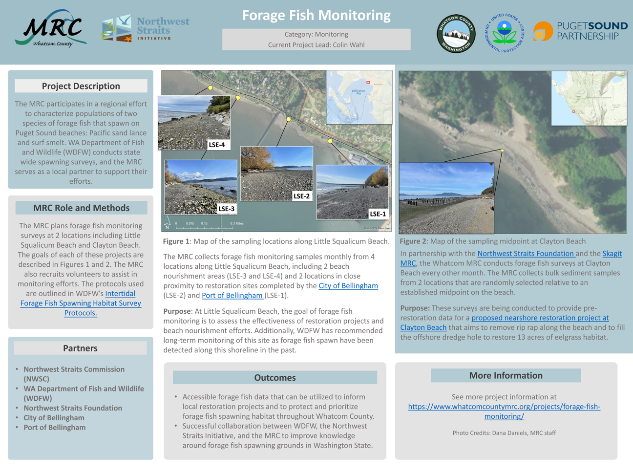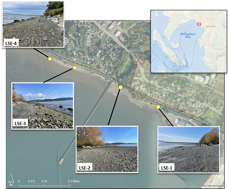 The MRC collects forage fish monitoring samples monthly from 4 locations along Little Squalicum Beach, including 2 beach nourishment areas (LSE-3 and LSE-4) and 2 locations in close proximity to restoration sites completed by the City of Bellingham (LSE-2) and in progress by the Port of Bellingham (LSE-1).