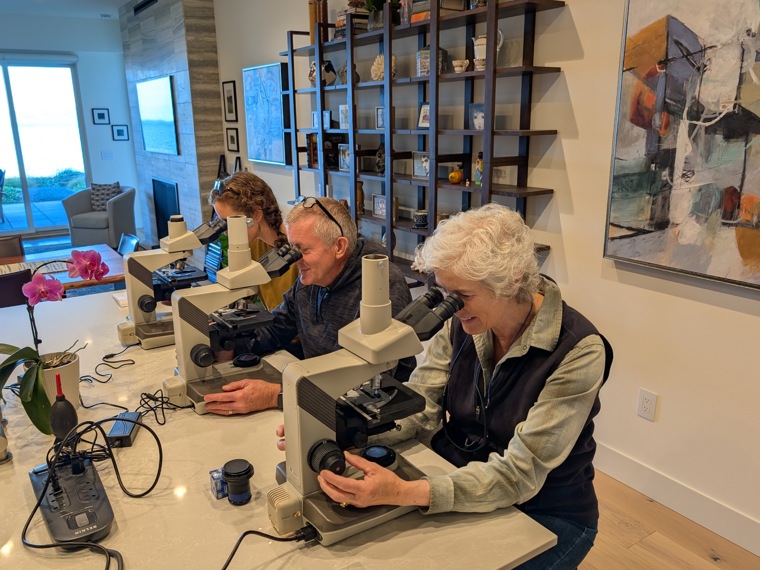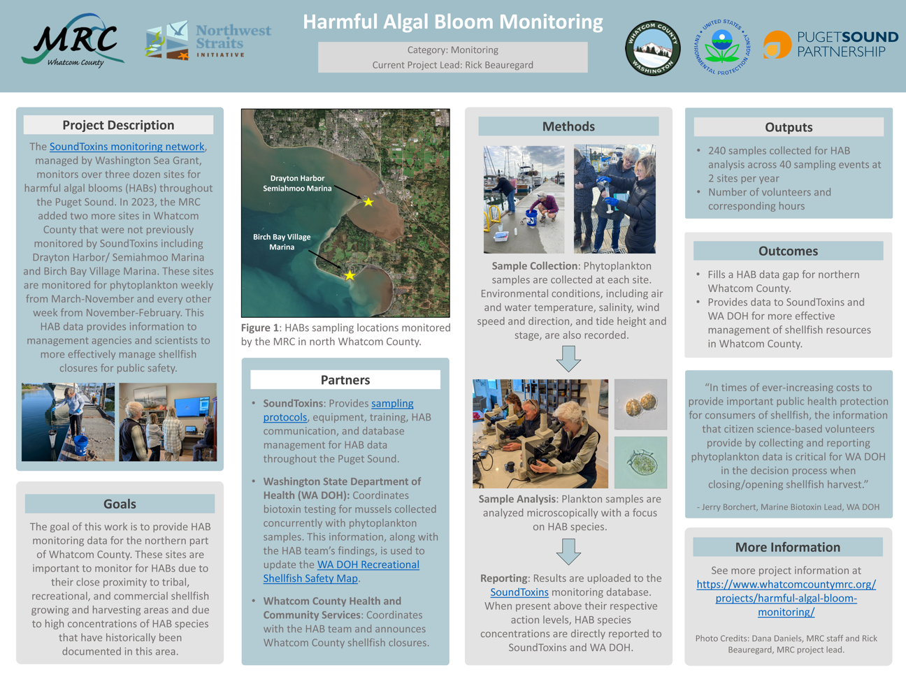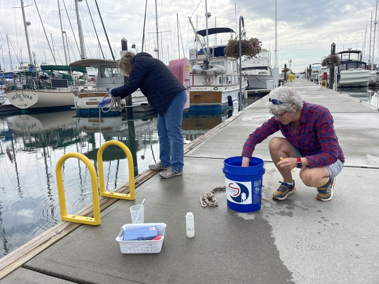Volunteers collect environmental data and a plankton sample for HAB analysis.